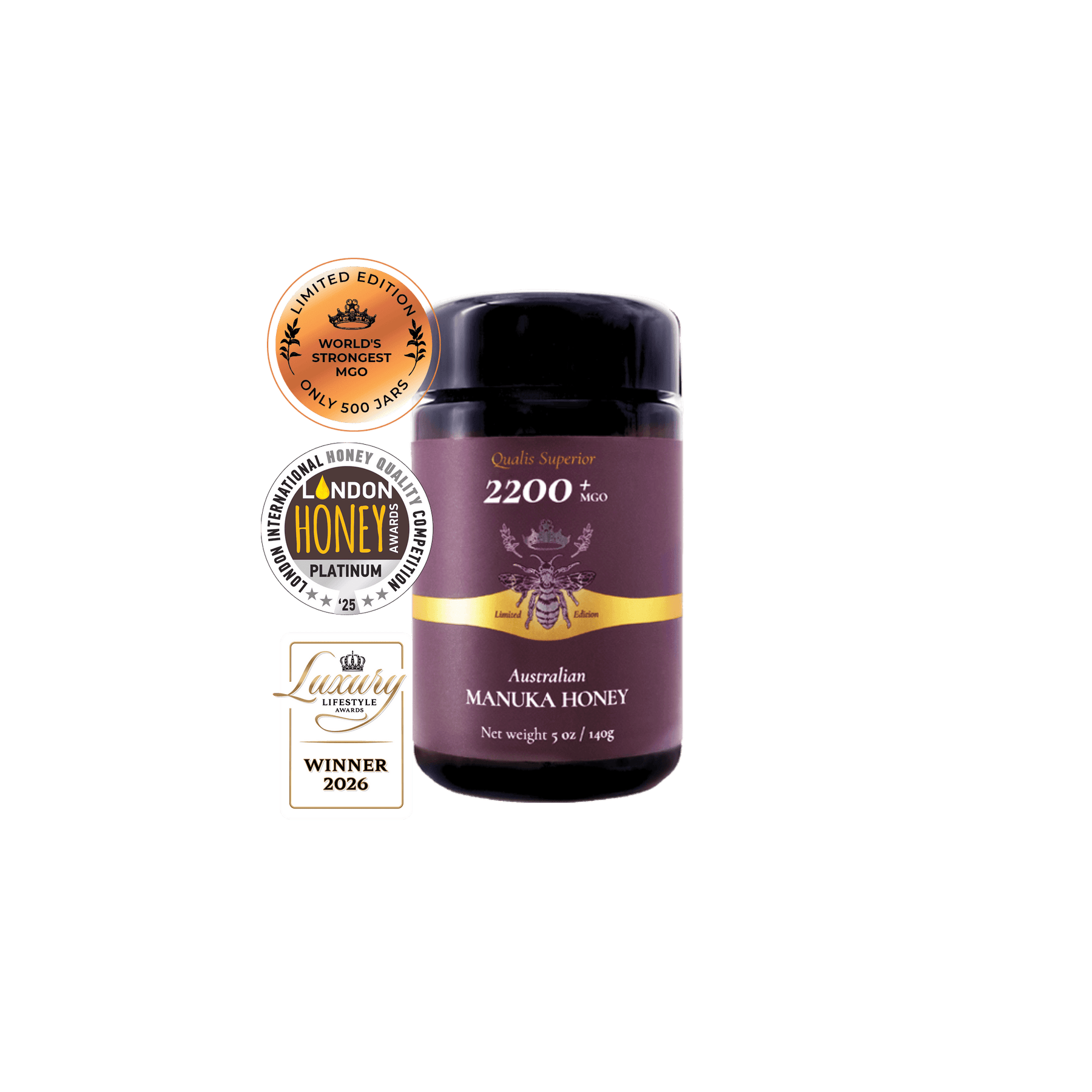 World's strongest Manuka Honey MGO 2200+ (70g) with award badges